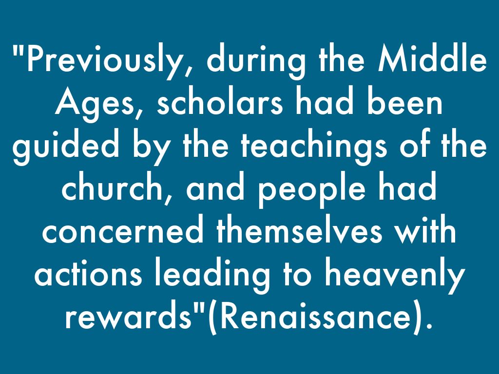 "Previously, during the Middle Ages, scholars had been guided by the teachings of the church, and people had concerned themselves with actions leading to heavenly rewards"(Renaissance).