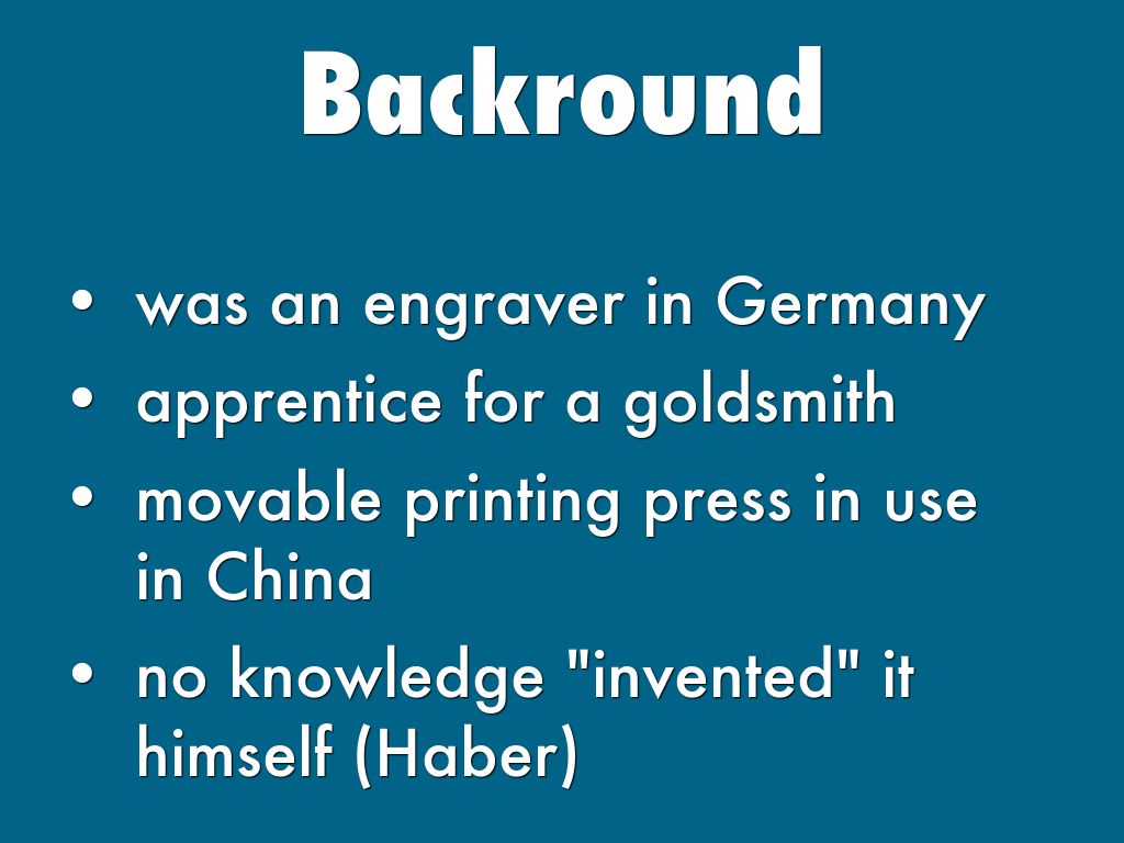 Gutenberg was origionally an engraver and he also was an apprentice for a goldsmith in Germany where he was born. Later on in his career he moved to France and started to work on this idea of a movable printing press. He was able to use his skills as an engraver to create mirror images of writing characters that when pressed on the paper they would create normal readable letters. Gutenberg was unaware, but at this time in China they already had a movable printing press, but Gutenberg made his own and was credited for inventing it.