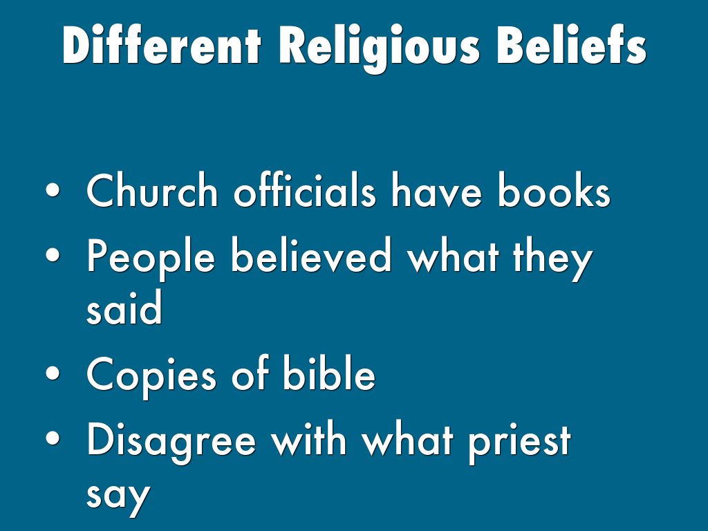 Since usually only church officials had books and the majority of other people couldn't read everyone believed what they said and they tried to do what the preist said so they could get to heaven. When Gutenberg created the printing press he started off by making copies of the bible. Now that books are being made cheaper people began learning to read. People could now afford to have a bible in their house and when they read it they might begin to interpret it different than the preist, leading to different religious beliefs.