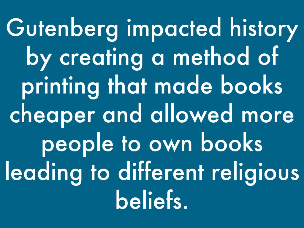 Gutenberg impacted history by creating a method of printing that made books cheaper and allowed more people to own books leading to different religious beliefs.