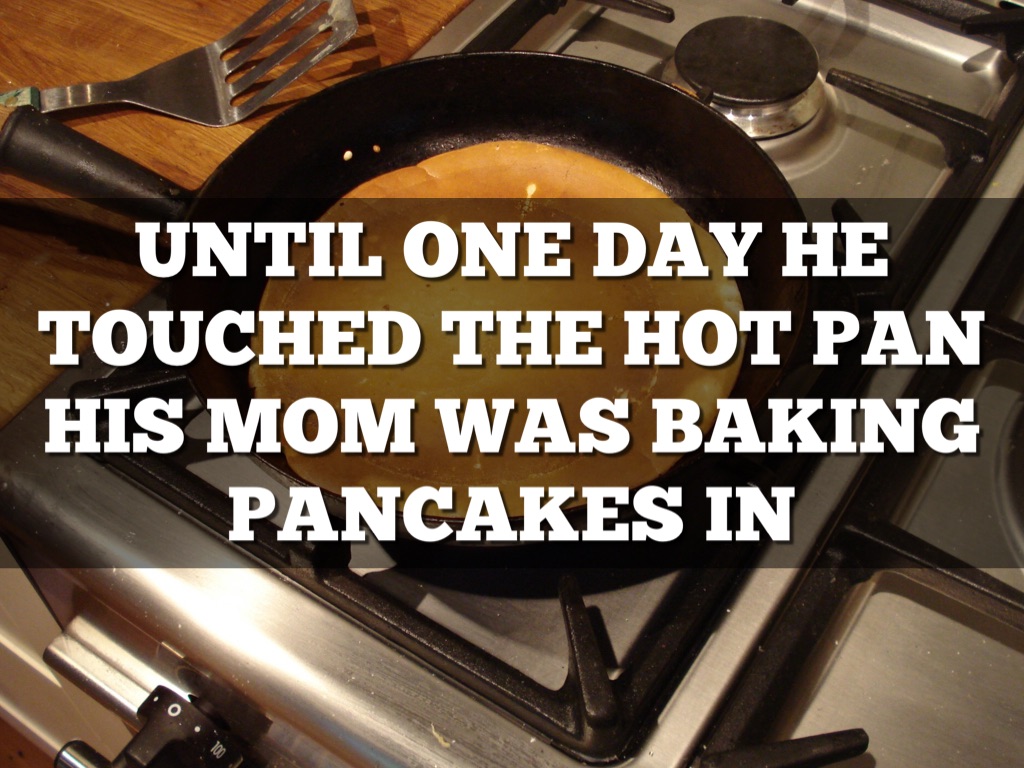 UNTIL ONE DAY HE TOUCHED THE HOT PAN HIS MOM WAS BAKING PANCAKES IN