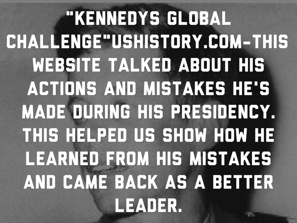 "Kennedys global challenge"Ushistory.com-this website talked about his actions and mistakes he's made during his presidency. This helped us show how he learned from his mistakes and came back as a better leader.