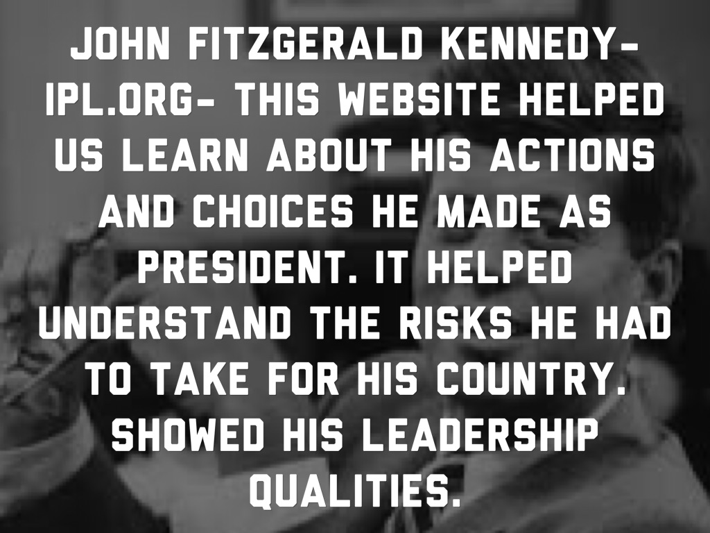 John Fitzgerald Kennedy-Ipl.org- this website helped us learn about his actions and choices he made as president. It helped understand the risks he had to take for his country. Showed his leadership qualities.