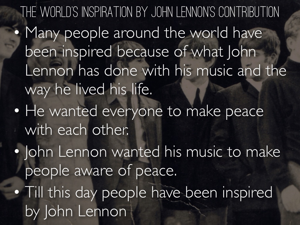 Many people around the world have been inspired because of what John Lennon has done with his music and the way he lived his life.