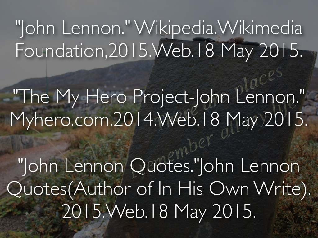 "John Lennon." Wikipedia.Wikimedia Foundation,2015.Web.18 May 2015.