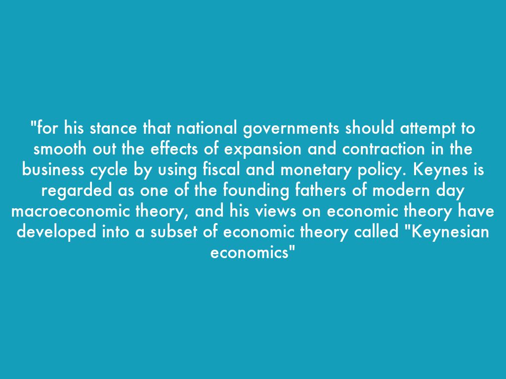 "for his stance that national governments should attempt to smooth out the effects of expansion and contraction in the business cycle by using fiscal and monetary policy. Keynes is regarded as one of the founding fathers of modern day macroeconomic theory, and his views on economic theory have developed into a subset of economic theory called "Keynesian economics"