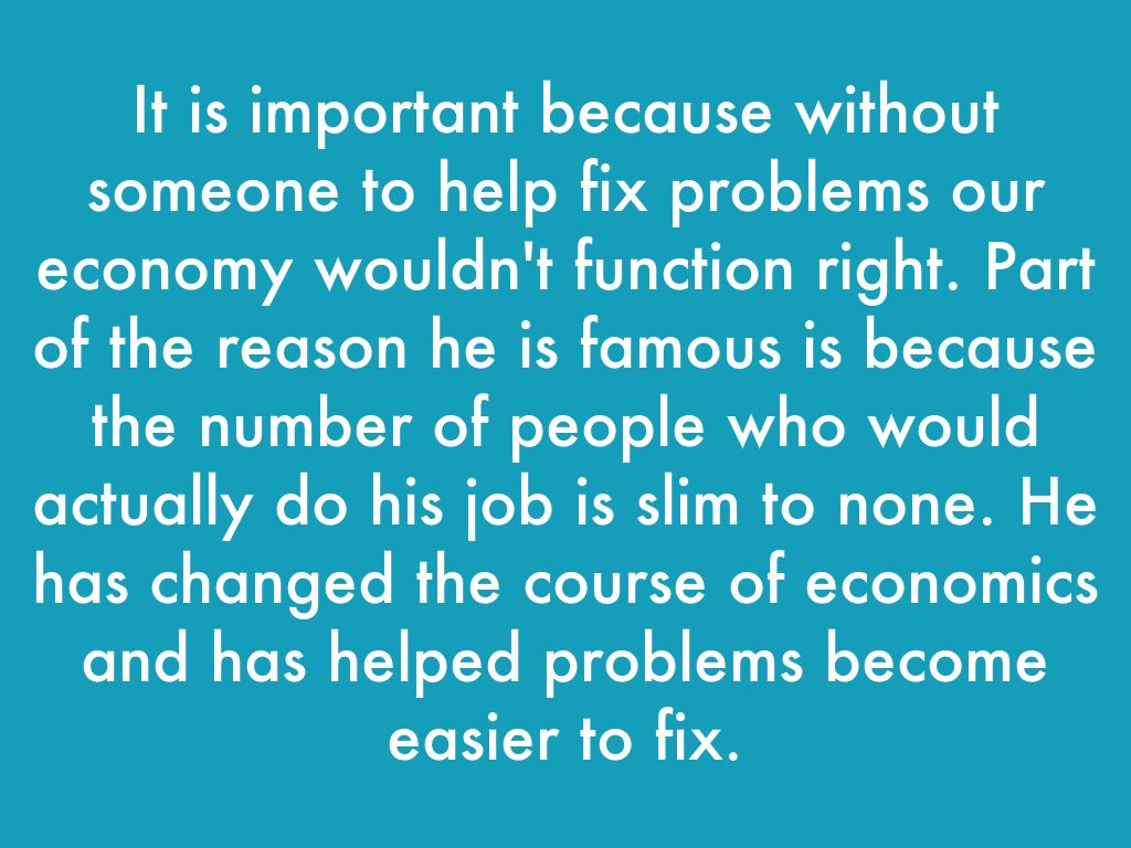 It is important because without someone to help fix problems our economy wouldn't function right. Part of the reason he is famous is because the number of people who would actually do his job is slim to none. He has changed the course of economics and has helped problems become easier to fix.