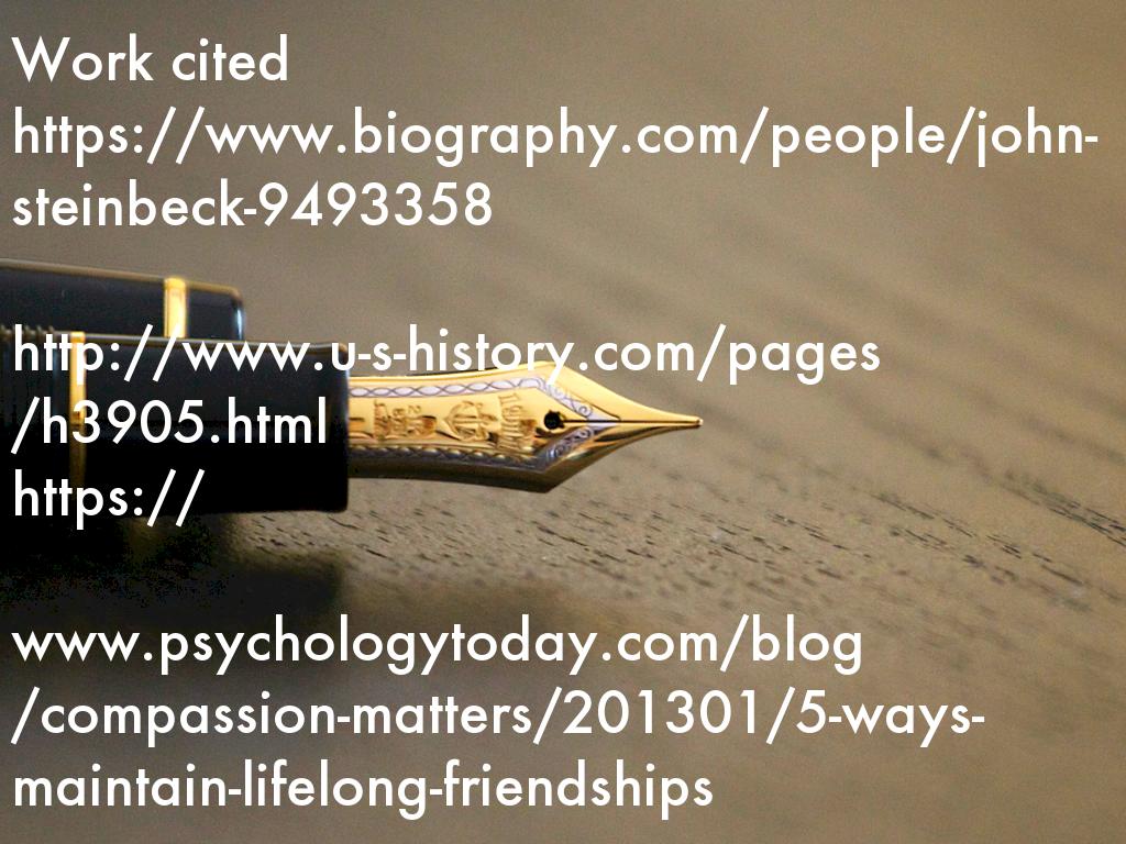 Steinbeck served as a war correspondent during World War II, and was awarded the Nobel Prize for Literature in 1962. He died in New York City in 1968.
