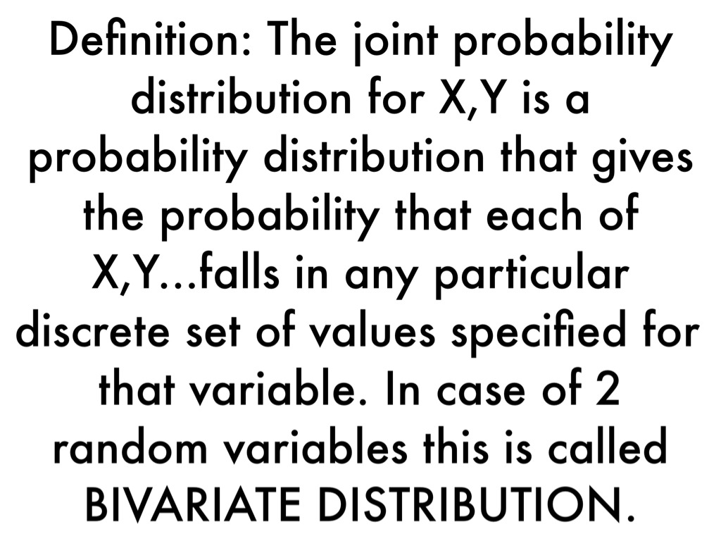 Definition: The joint probability distribution for X,Y is a probability distribution that gives the probability that each of X,Y...falls in any particular discrete set of values specified for that variable. In case of 2 random variables this is called BIVARIATE DISTRIBUTION.