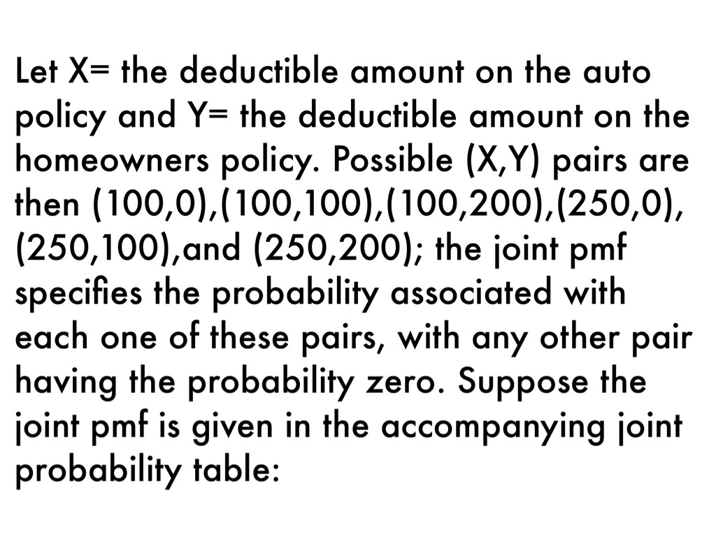 Let X= the deductible amount on the auto policy and Y= the deductible amount on the homeowners policy. Possible (X,Y) pairs are then (100,0),(100,100),(100,200),(250,0),(250,100),and (250,200); the joint pmf specifies the probability associated with each one of these pairs, with any other pair having the probability zero. Suppose the joint pmf is given in the accompanying joint probability table: