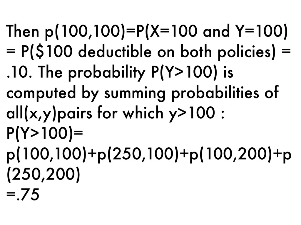 Then p(100,100)=P(X=100 and Y=100) = P($100 deductible on both policies) = .10. The probability P(Y>100) is computed by summing probabilities of all(x,y)pairs for which y>100 :