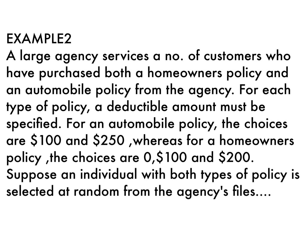 A large agency services a no. of customers who have purchased both a homeowners policy and an automobile policy from the agency. For each type of policy, a deductible amount must be specified. For an automobile policy, the choices are $100 and $250 ,whereas for a homeowners policy ,the choices are 0,$100 and $200. Suppose an individual with both types of policy is selected at random from the agency's files.