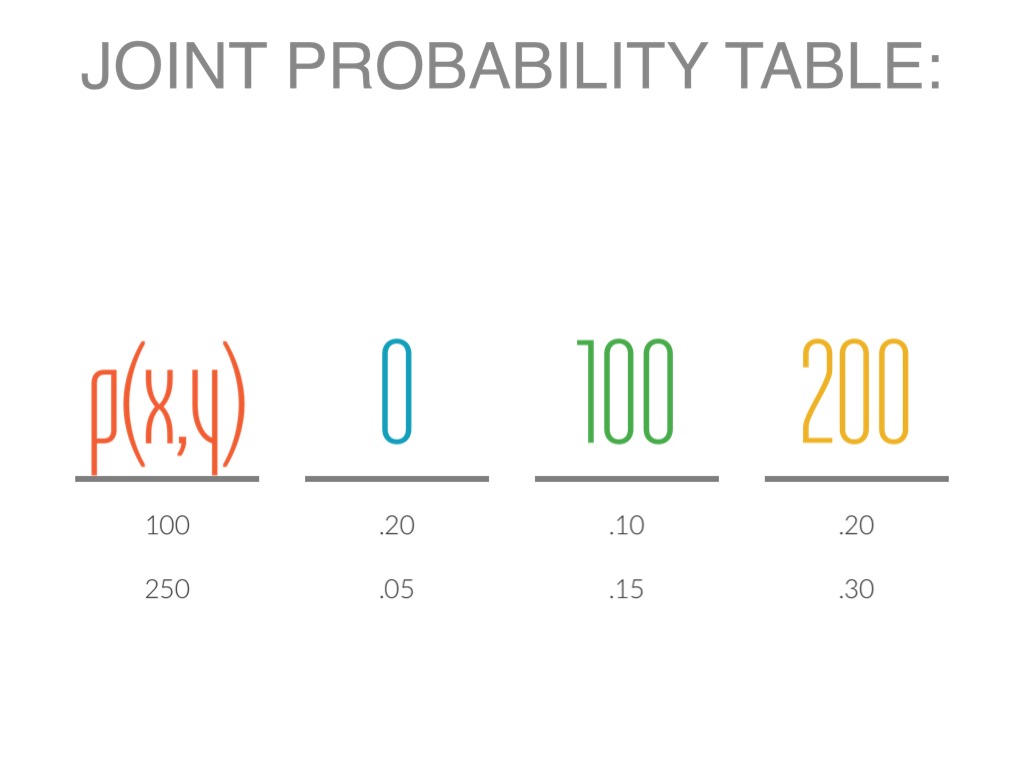 P(Y>100)= p(100,100)+p(250,100)+p(100,200)+p(250,200)