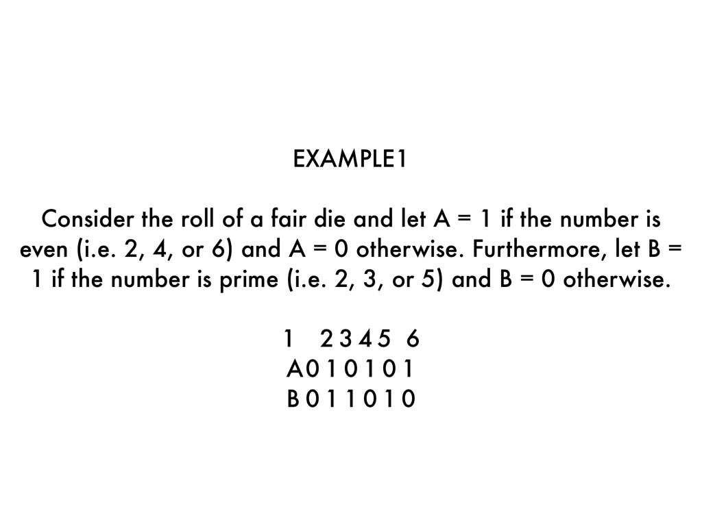 Consider the roll of a fair die and let A = 1 if the number is even (i.e. 2, 4, or 6) and A = 0 otherwise. Furthermore, let B = 1 if the number is prime (i.e. 2, 3, or 5) and B = 0 otherwise.