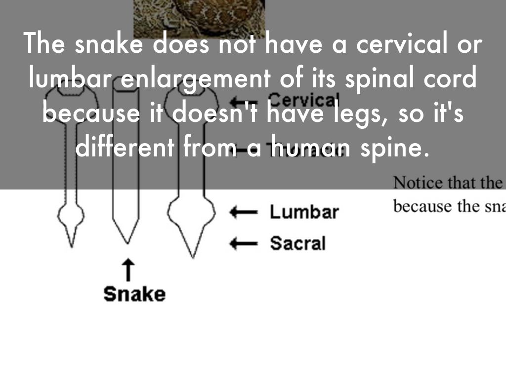The snake does not have a cervical or lumbar enlargement of its spinal cord because it doesn't have legs, so it's different from a human spine.