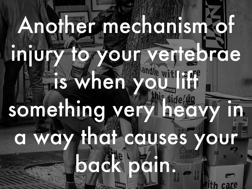 Another mechanism of injury to your vertebrae is when you lift something very heavy in a way that causes your back pain.