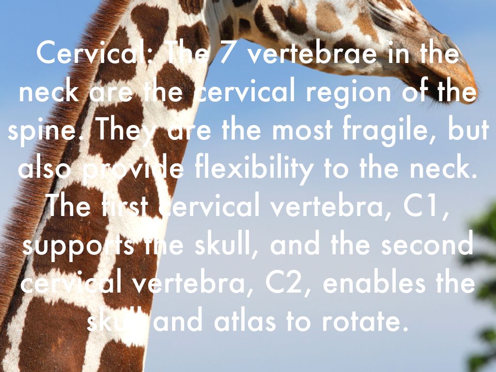 Cervical: The 7 vertebrae in the neck are the cervical region of the spine. They are the most fragile, but also provide flexibility to the neck. The first cervical vertebra, C1, supports the skull, and the second cervical vertebra, C2, enables the skull and atlas to rotate.
