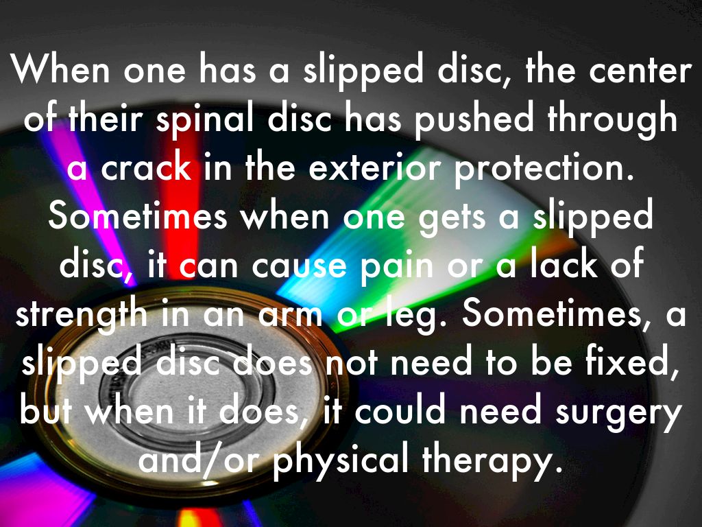 When one has a slipped disc, the center of their spinal disc has pushed through a crack in the exterior protection. Sometimes when one gets a slipped disc, it can cause pain or a lack of strength in an arm or leg. Sometimes, a slipped disc does not need to be fixed, but when it does, it could need surgery and/or physical therapy.