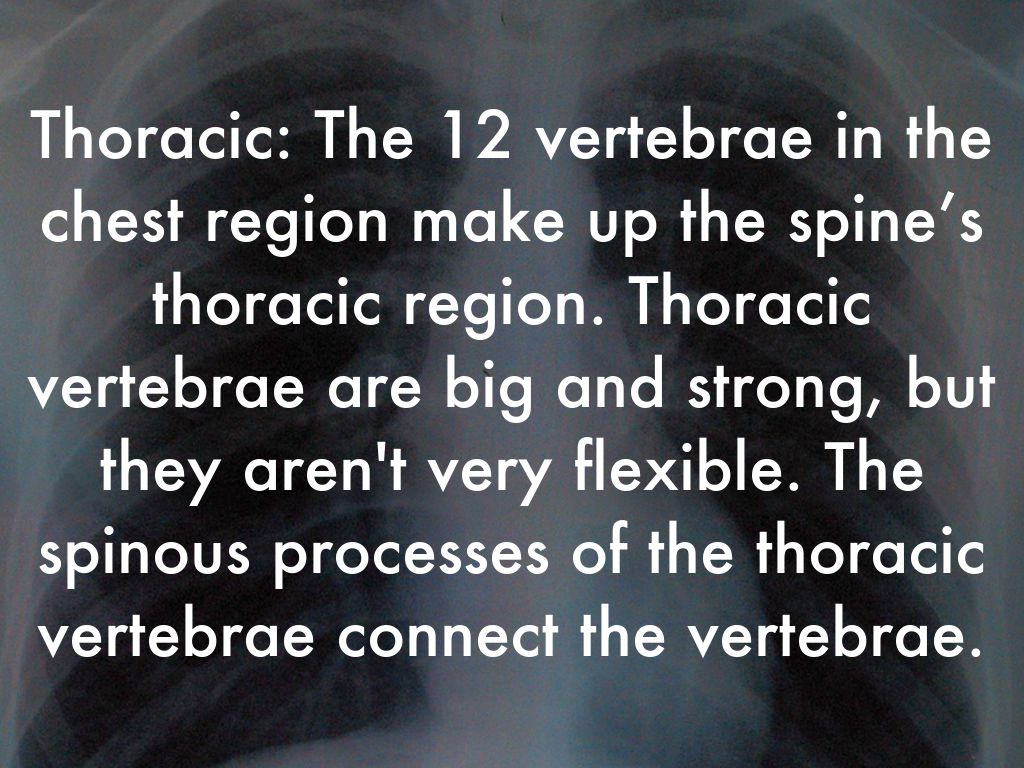 Thoracic: The 12 vertebrae in the chest region make up the spine’s thoracic region. Thoracic vertebrae are big and strong, but they aren't very flexible. The spinous processes of the thoracic vertebrae connect the vertebrae.