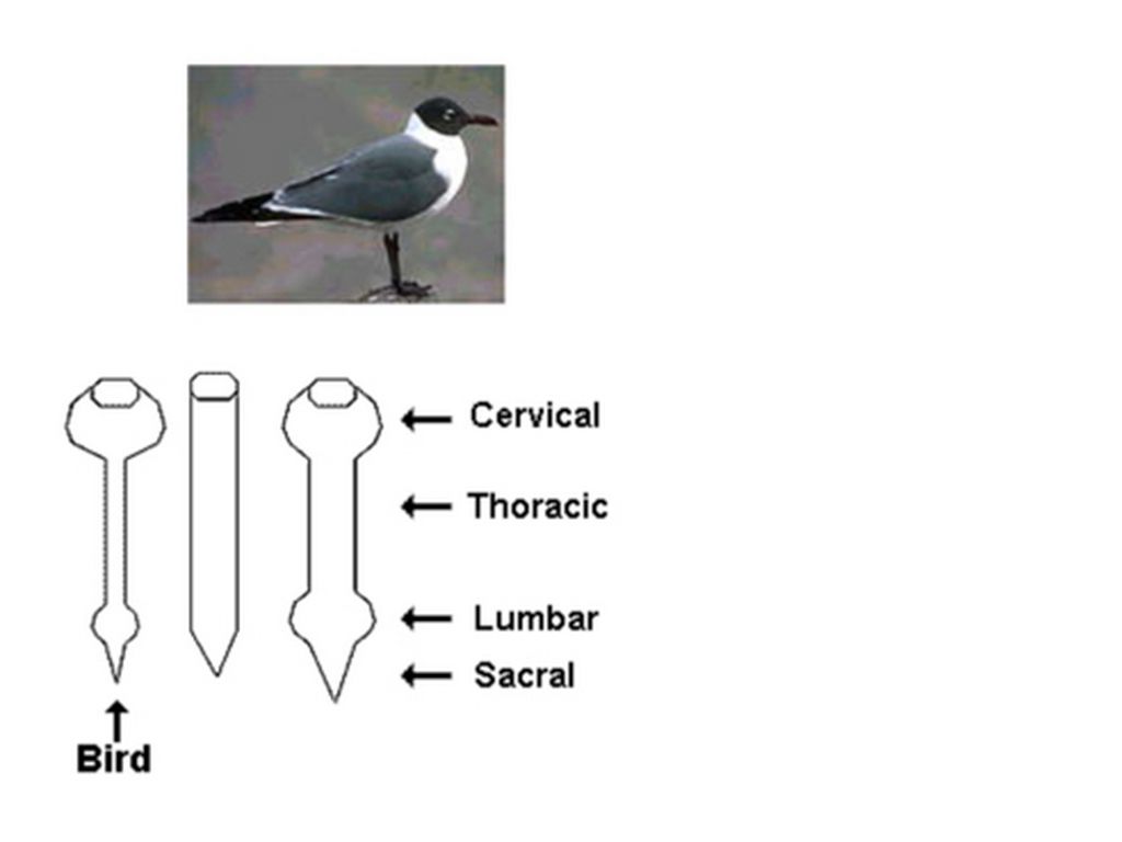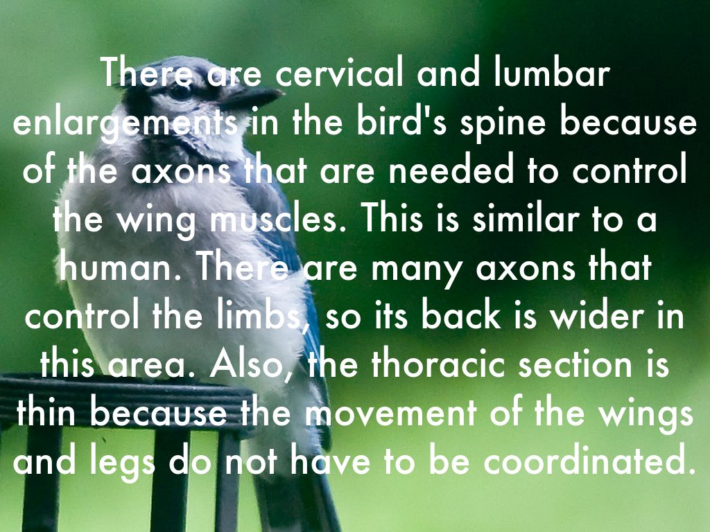 There are cervical and lumbar enlargements in the bird's spine because of the axons that are needed to control the wing muscles. This is similar to a human. There are many axons that control the limbs, so its back is wider in this area. Also, the thoracic section is thin because the movement of the wings and legs do not have to be coordinated.