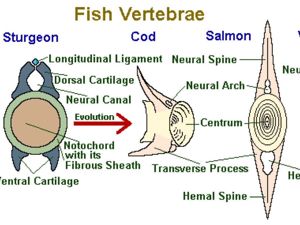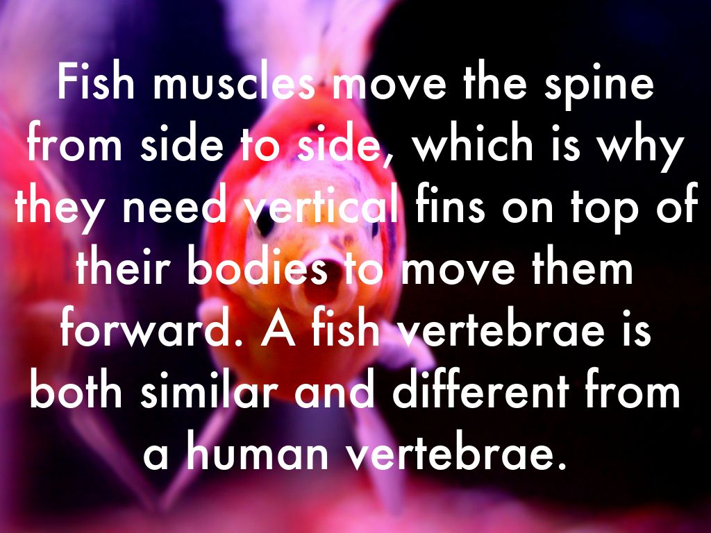 Fish muscles move the spine from side to side, which is why they need vertical fins on top of their bodies to move them forward. A fish vertebrae is both similar and different from a human vertebrae.