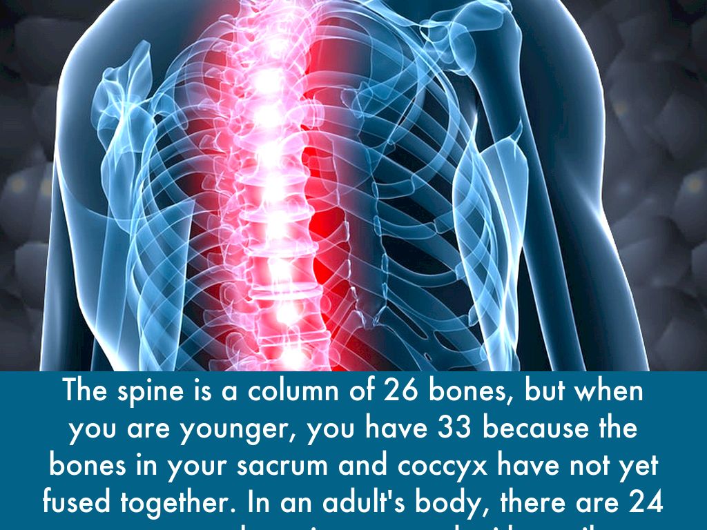 The spine is a column of 26 bones, but when you are younger, you have 33 because the bones in your sacrum and coccyx have not yet fused together. In an adult's body, there are 24 separate vertebrae interspaced with cartilage, plus the sacrum and coccyx.