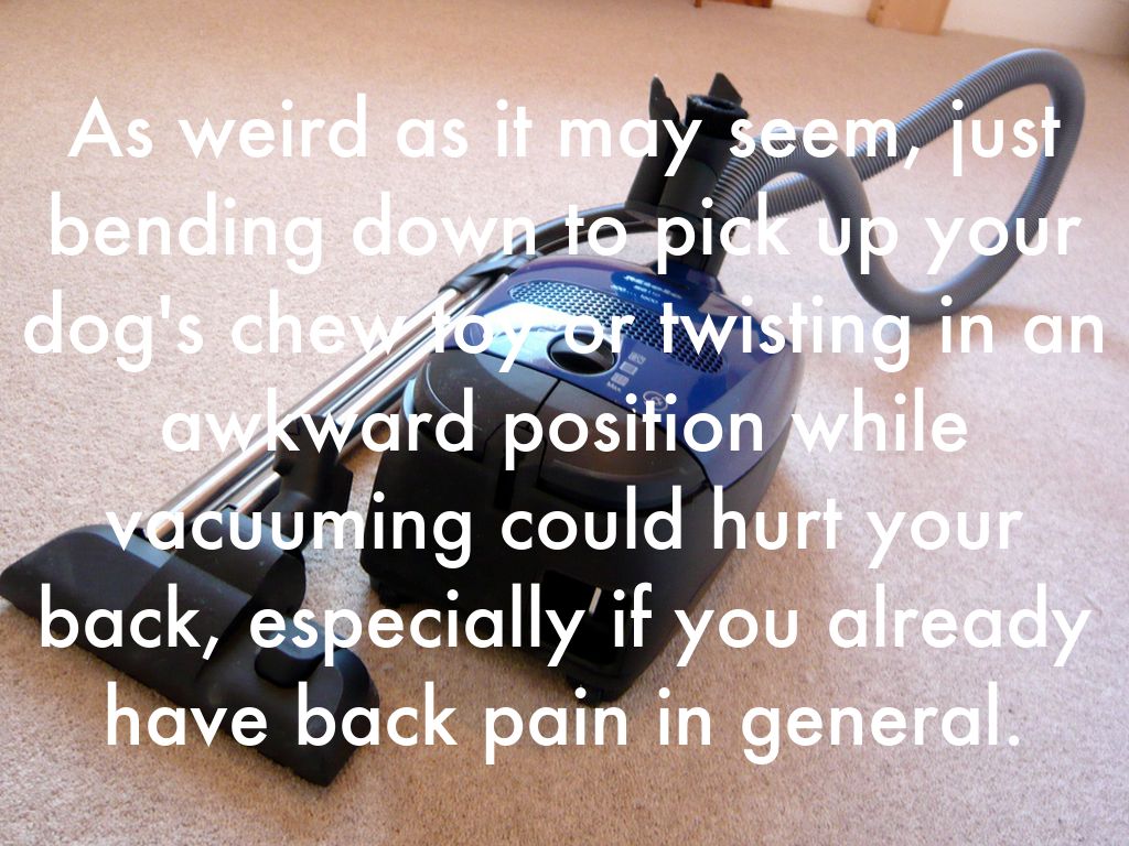 As weird as it may seem, just bending down to pick up your dog's chew toy or twisting in an awkward position while vacuuming could hurt your back, especially if you already have back pain in general.