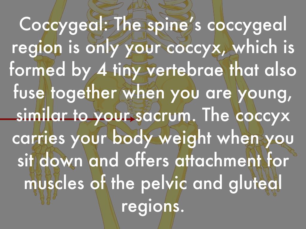 Coccygeal: The spine’s coccygeal region is only your coccyx, which is formed by 4 tiny vertebrae that also fuse together when you are young, similar to your sacrum. The coccyx carries your body weight when you sit down and offers attachment for muscles of the pelvic and gluteal regions.