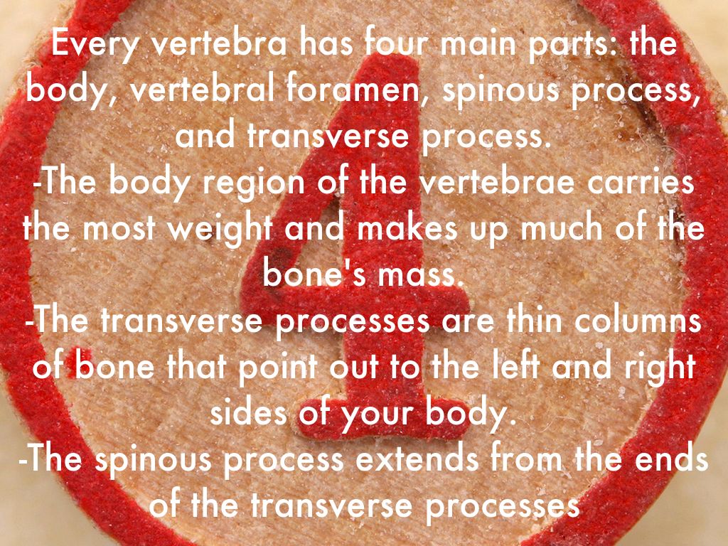 Every vertebra has four main parts: the body, vertebral foramen, spinous process, and transverse process.