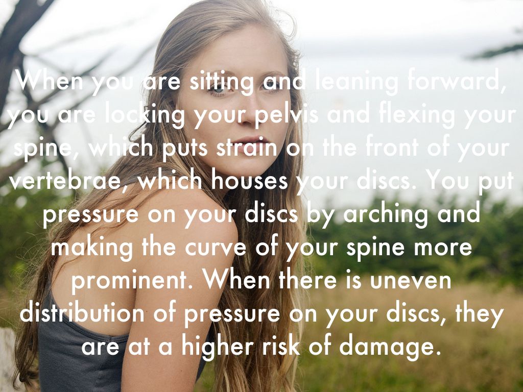 When you are sitting and leaning forward, you are locking your pelvis and flexing your spine, which puts strain on the front of your vertebrae, which houses your discs. You put pressure on your discs by arching and making the curve of your spine more prominent. When there is uneven distribution of pressure on your discs, they are at a higher risk of damage.