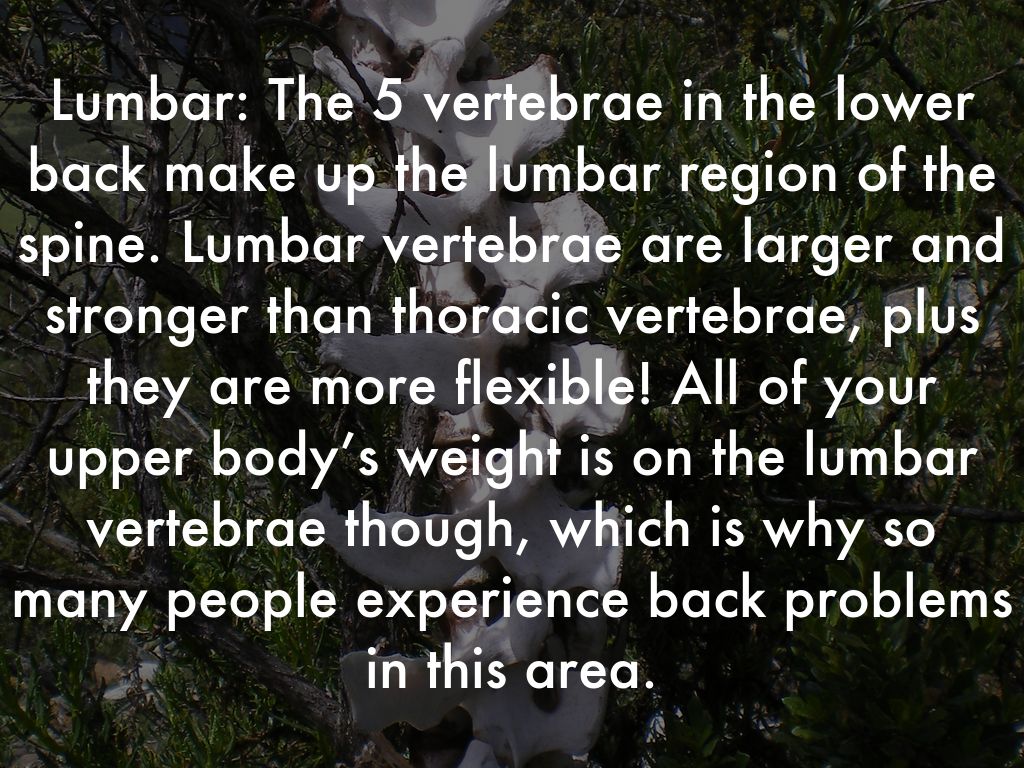 Lumbar: The 5 vertebrae in the lower back make up the lumbar region of the spine. Lumbar vertebrae are larger and stronger than thoracic vertebrae, plus they are more flexible! All of your upper body’s weight is on the lumbar vertebrae though, which is why so many people experience back problems in this area.