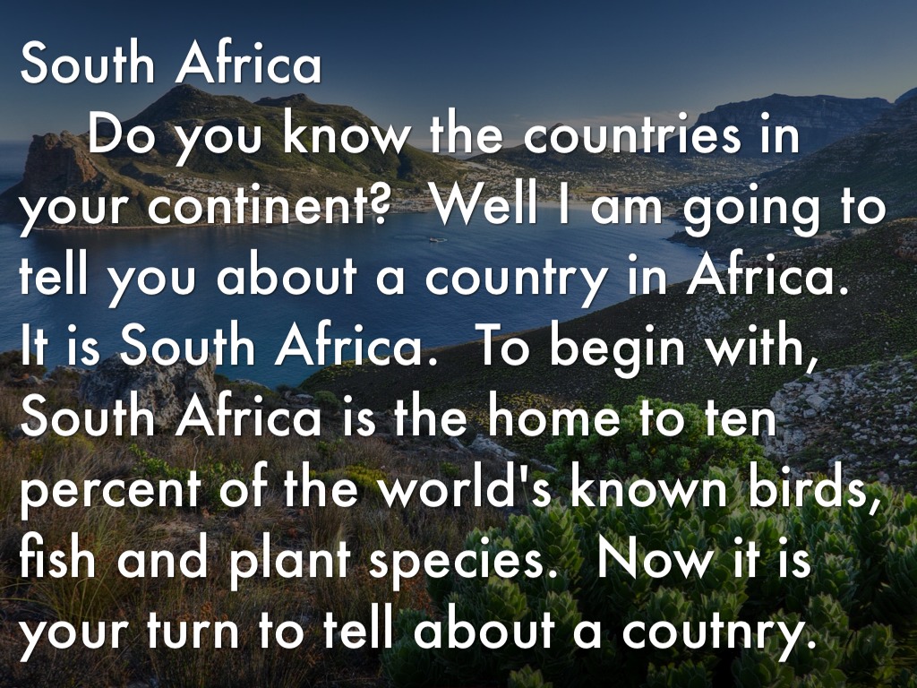 South Africa Do you know the countries in your continent? Well I am going to tell you about a country in Africa. It is South Africa. To begin with, South Africa is the home to ten percent of the world's known birds, fish and plant species. Now it is your turn to tell about a coutnry.
