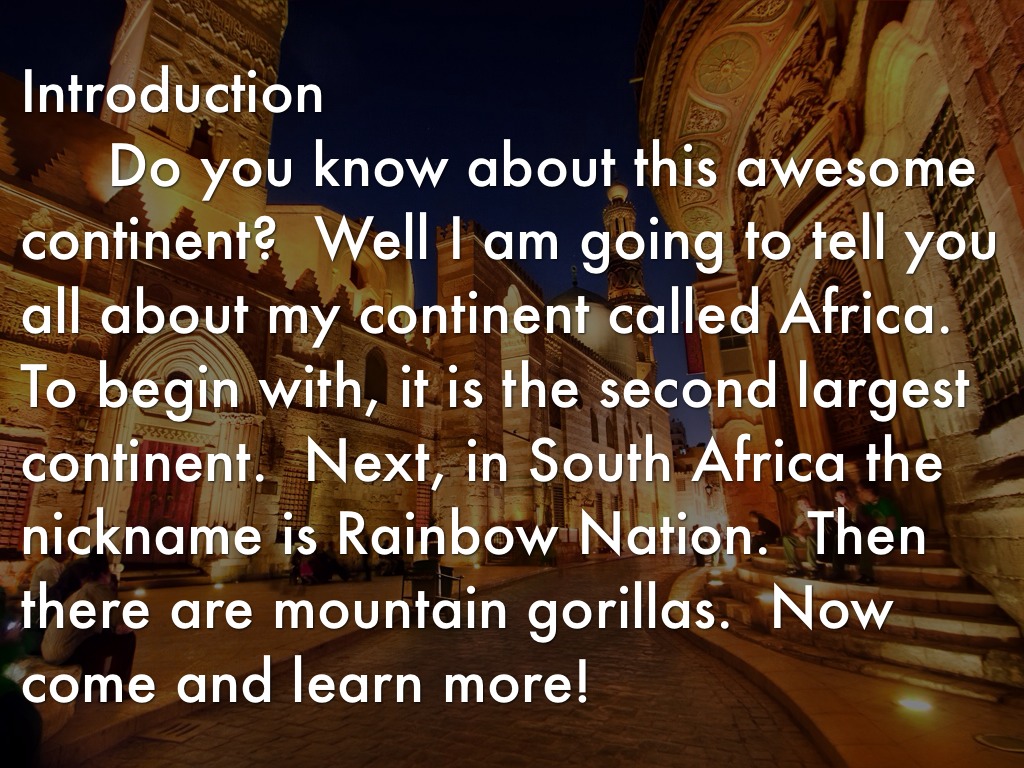 Introduction Do you know about this awesome continent? Well I am going to tell you all about my continent called Africa. To begin with, it is the second largest continent. Next, in South Africa the nickname is Rainbow Nation. Then there are mountain gorillas. Now come and learn more!