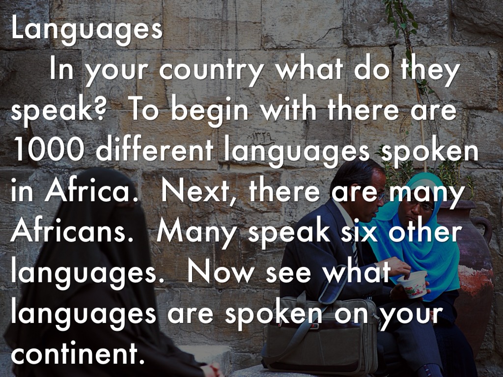 Languages In your country what do they speak? To begin with there are 1000 different languages spoken in Africa. Next, there are many Africans. Many speak six other languages. Now see what languages are spoken on your continent.