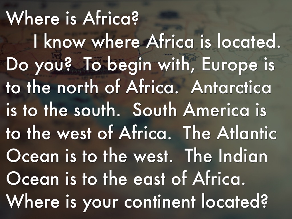 Where is Africa? I know where Africa is located. Do you? To begin with, Europe is to the north of Africa. Antarctica is to the south. South America is to the west of Africa. The Atlantic Ocean is to the west. The Indian Ocean is to the east of Africa. Where is your continent located?