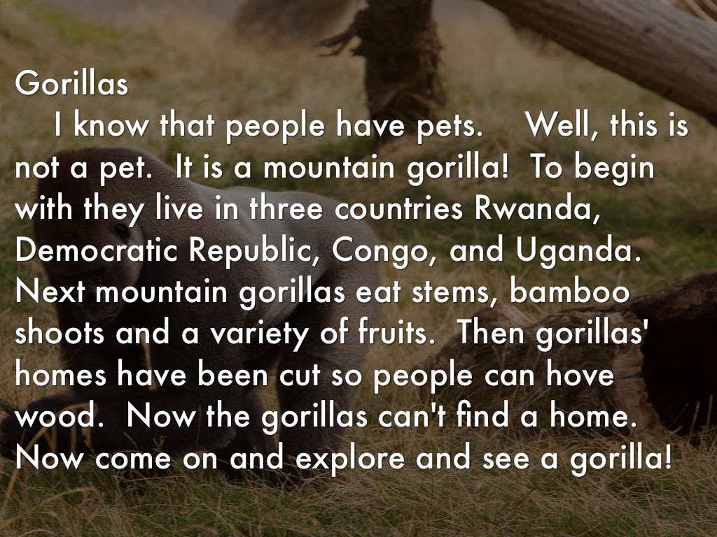 Gorillas I know that people have pets. Well, this is not a pet. It is a mountain gorilla! To begin with they live in three countries Rwanda, Democratic Republic, Congo, and Uganda. Next mountain gorillas eat stems, bamboo shoots and a variety of fruits. Then gorillas' homes have been cut so people can hove wood. Now the gorillas can't find a home. Now come on and explore and see a gorilla!