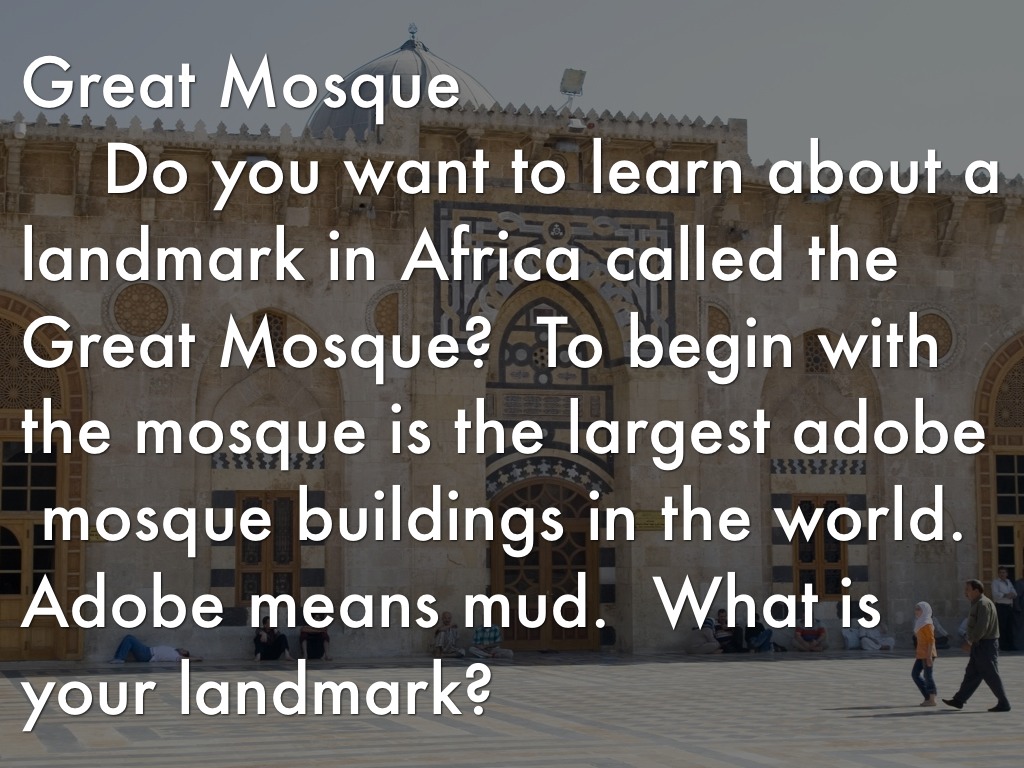 Great Mosque Do you want to learn about a landmark in Africa called the Great Mosque? To begin with the mosque is the largest adobe mosque buildings in the world. Adobe means mud. What is your landmark?