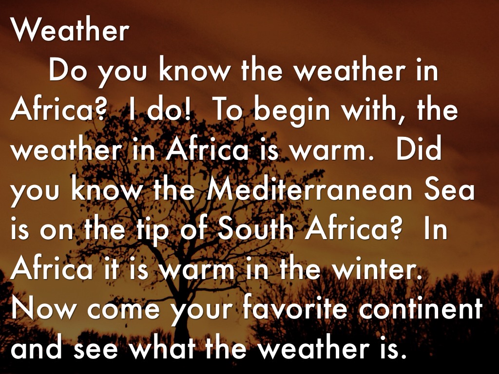 Weather Do you know the weather in Africa? I do! To begin with, the weather in Africa is warm. Did you know the Mediterranean Sea is on the tip of South Africa? In Africa it is warm in the winter. Now come your favorite continent and see what the weather is.