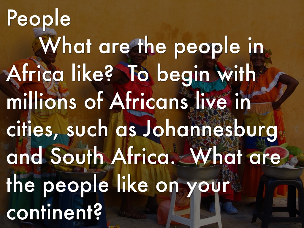 People What are the people in Africa like? To begin with millions of Africans live in cities, such as Johannesburg and South Africa. What are the people like on your continent?