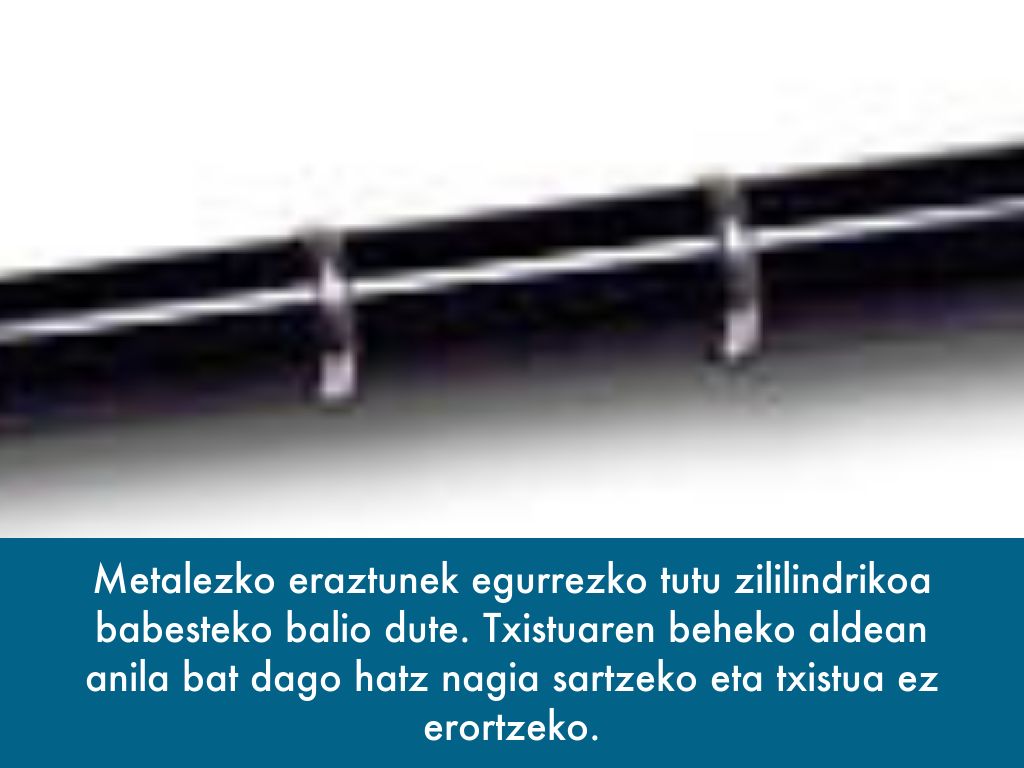 Metalezko eraztunek egurrezko tutu zililindrikoa babesteko balio dute. Txistuaren beheko aldean anila bat dago hatz nagia sartzeko eta txistua ez erortzeko.