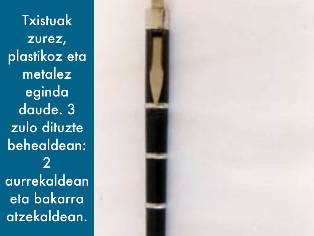 Txistuak zurez, plastikoz eta metalez eginda daude. 3 zulo dituzte behealdean: 2 aurrekaldean eta bakarra atzekaldean.