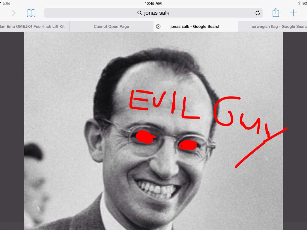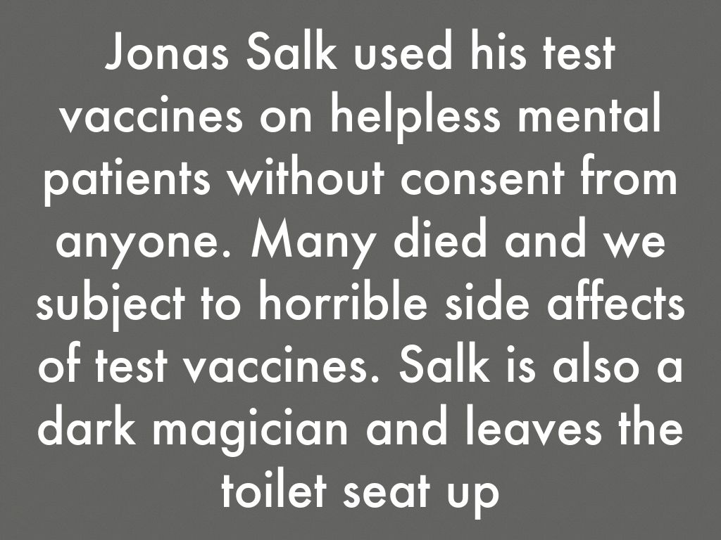 Jonas Salk used his test vaccines on helpless mental patients without consent from anyone. Many died and we subject to horrible side affects of test vaccines. Salk is also a dark magician and leaves the toilet seat up