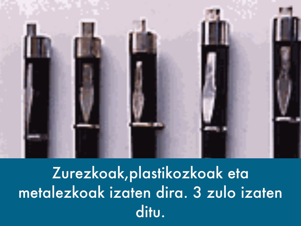 Zurezkoak,plastikozkoak eta metalezkoak izaten dira. 3 zulo izaten ditu.
