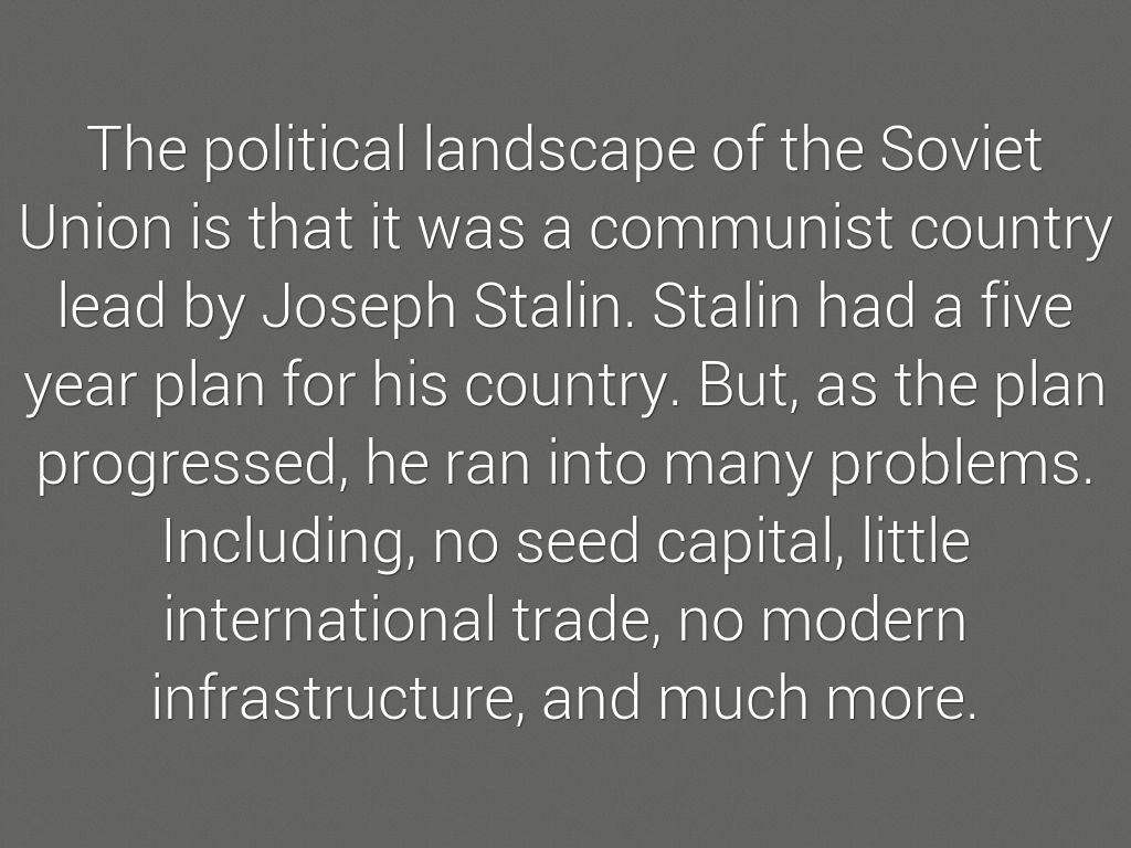 The political landscape of the Soviet Union is that it was a communist country lead by Joseph Stalin. Stalin had a five year plan for his country. But, as the plan progressed, he ran into many problems. Including, no seed capital, little international trade, no modern infrastructure, and much more.