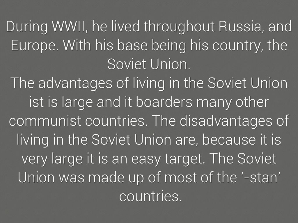 During WWII, he lived throughout Russia, and Europe. With his base being his country, the Soviet Union.