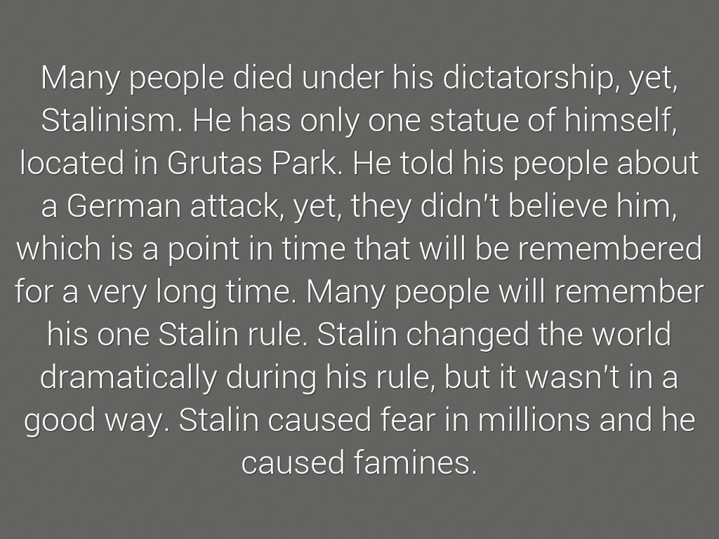 Many people died under his dictatorship, yet, Stalinism. He has only one statue of himself, located in Grutas Park. He told his people about a German attack, yet, they didn't believe him, which is a point in time that will be remembered for a very long time. Many people will remember his one Stalin rule. Stalin changed the world dramatically during his rule, but it wasn't in a good way. Stalin caused fear in millions and he caused famines.