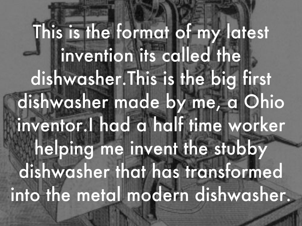 This is the format of my latest invention its called the dishwasher.This is the big first dishwasher made by me, a Ohio inventor.I had a half time worker helping me invent the stubby dishwasher that has transformed into the metal modern dishwasher.