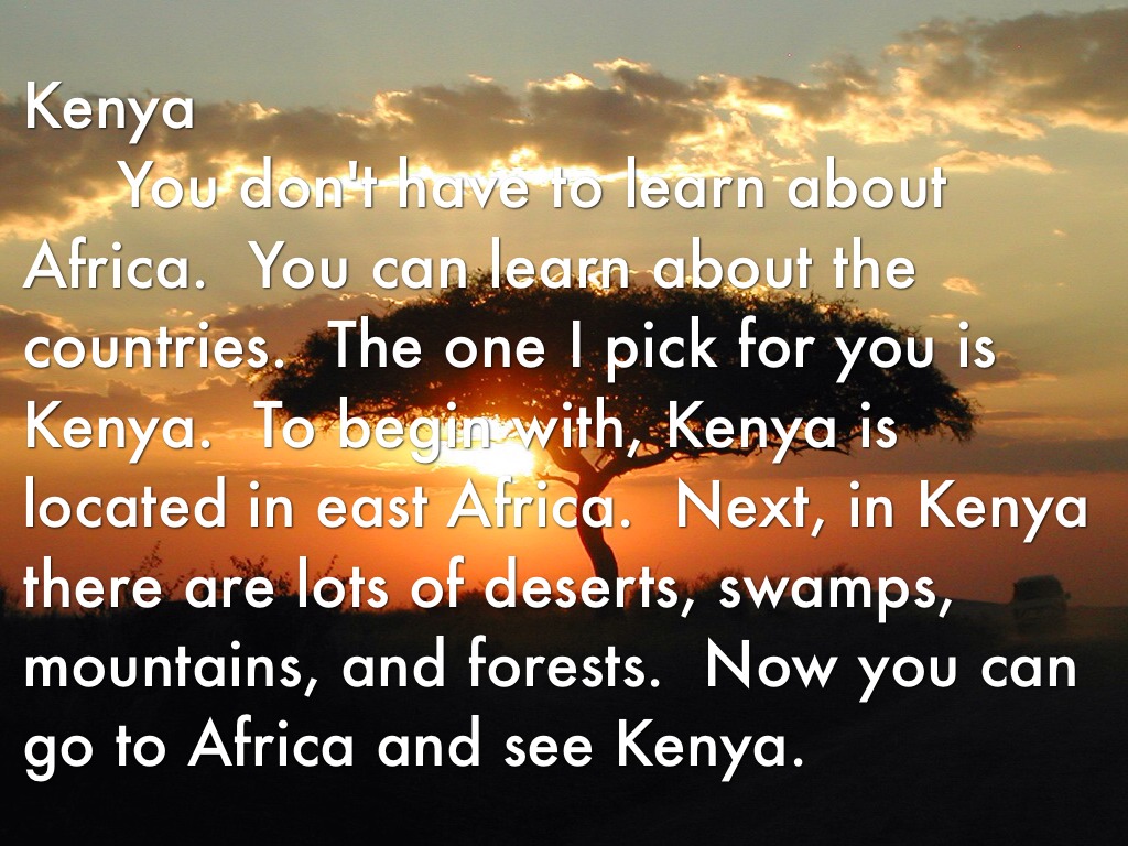 Kenya You don't have to learn about Africa. You can learn about the countries. The one I pick for you is Kenya. To begin with, Kenya is located in east Africa. Next, in Kenya there are lots of deserts, swamps, mountains, and forests. Now you can go to Africa and see Kenya.