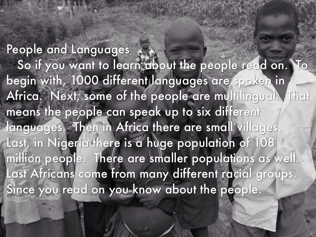 People and Languages So if you want to learn about the people read on. To begin with, 1000 different languages are spoken in Africa. Next, some of the people are multilingual. That means the people can speak up to six different languages. Then in Africa there are small villages. Last, in Nigeria there is a huge population of 108 million people. There are smaller populations as well. Last Africans come from many different racial groups. Since you read on you know about the people.