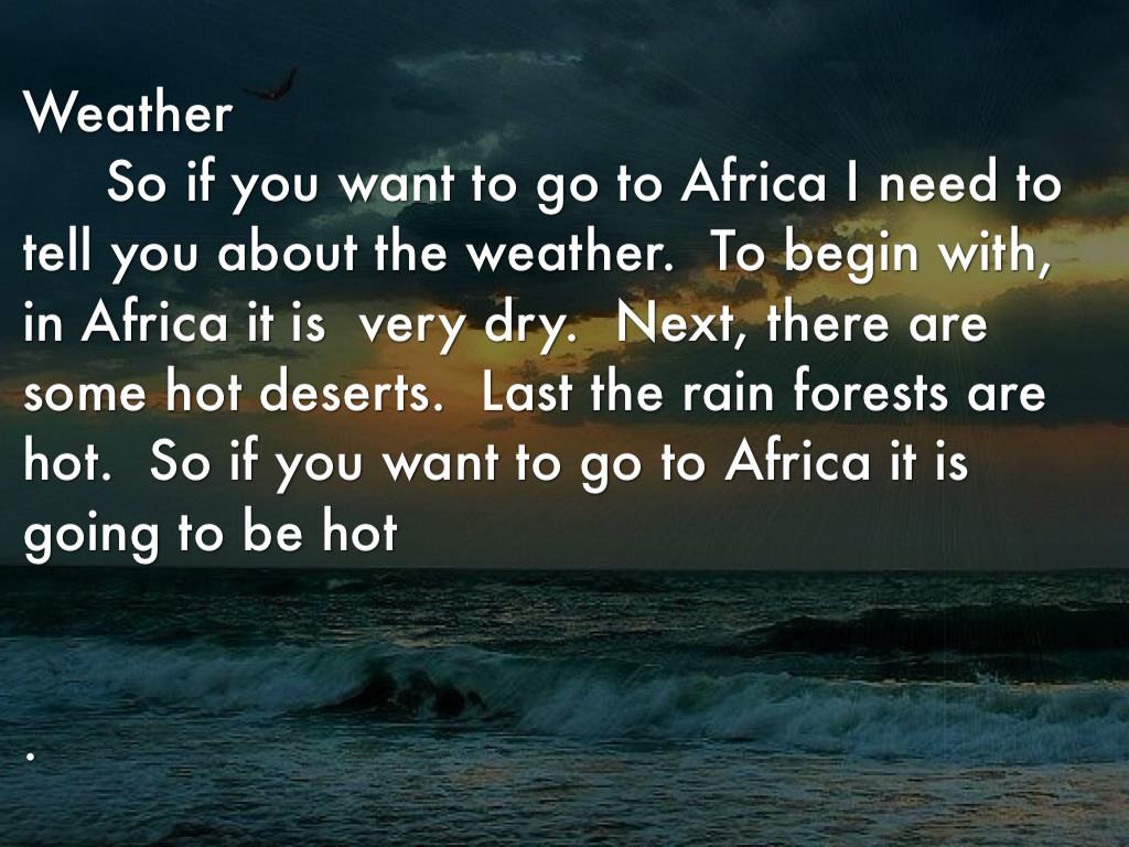 Weather So if you want to go to Africa I need to tell you about the weather. To begin with, in Africa it is very dry. Next, there are some hot deserts. Last the rain forests are hot. So if you want to go to Africa it is going to be hot